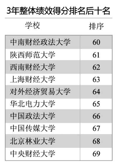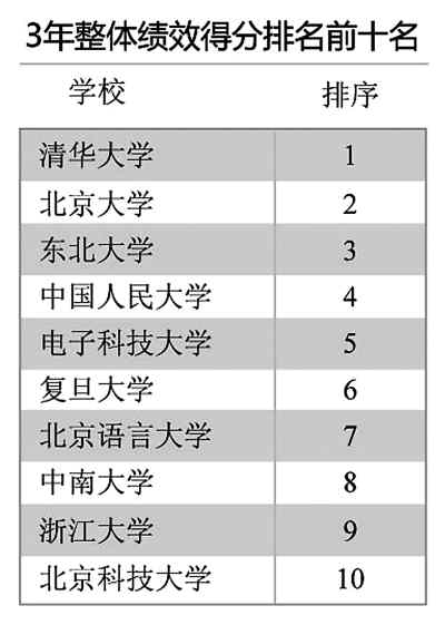 數(shù)據(jù)統(tǒng)計顯示:有近半數(shù)高校過去3年“投入多,產(chǎn)出少”;另有29所高!爱a(chǎn)出高于投入”;還有7所高校投入和產(chǎn)出的排名一致,“投入產(chǎn)出相當”。整體績效得分前3名的高校分別是清華大學、北京大學、東北大學。