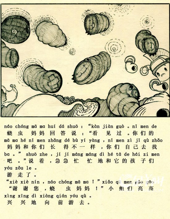 最近,關于《小蝌蚪找媽媽》原著的改編又有了新動作———有網(wǎng)友把《小蝌蚪找媽媽》的主角小蝌蚪改成了小蛆蟲,故事里原來的配角鯉魚、烏龜、白鵝則變成了蟯蟲、線蟲和屎殼郎。有一位80后的小青年還給改編的文字配上自己創(chuàng)作的情景漫畫圖,再加進文字與拼音標注,《小蝌蚪找媽媽》就這樣變成了《小蛆蟲找媽媽》。