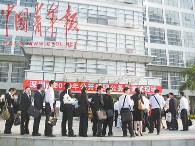 23歲的鐘文去年從深圳大學(xué)法學(xué)專業(yè)畢業(yè),她報考的是深圳市坪山新區(qū)執(zhí)法員的職位。和鐘文一樣來參加面試的考生有1036人,是從34545名考生中通過筆試篩選出來的“幸運兒”。今天,他們將經(jīng)歷又一次殘酷競爭——只有346人能最終進入深圳的聘任制公務(wù)員隊伍。
