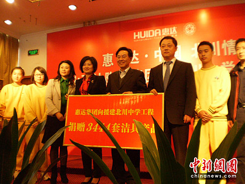 中新網(wǎng)綿陽4月19日電 (徐楊祎)“從唐山到北川,盡管路途遙遠(yuǎn),但我們的心是貼在一起的!19日下午,唐山惠達(dá)集團(tuán)執(zhí)行董事總經(jīng)理王彥慶在北川中學(xué)捐贈(zèng)儀式上說到。本次捐贈(zèng)是由唐山惠達(dá)集團(tuán)向即將落成的新北川中學(xué)捐贈(zèng)百萬的節(jié)水潔具。