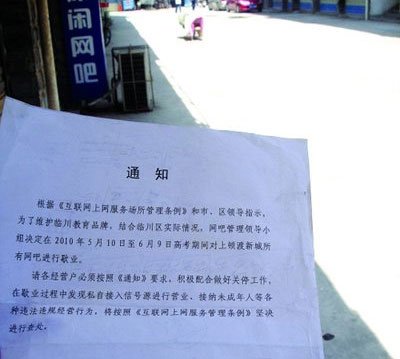 5月30日,有網友在天涯社區(qū)發(fā)帖稱,5月25日山西臨縣網吧協會貼出了網吧關閉的公告:“有關部門要求網吧停業(yè),具體何時開放另行通知!痹摼W友稱據傳是因為即將到來的高考而強制關閉了該縣城所有網吧,“全縣所有的網吧都在劫難逃,光纜被停,只能用電話線上網!