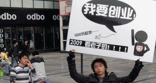 “我要?jiǎng)?chuàng)業(yè),1000元起步……2009,看老子的!”昨(8)日下午4時(shí)許,香檳廣場(chǎng)上,一名小伙子擺出一副“!奔軇(shì),舉著自制的告示牌,喊著“自主創(chuàng)業(yè)”的口號(hào),引來(lái)了附近路人紛紛駐足觀看。
