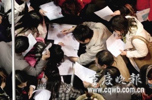 沙坪壩區(qū)人才市場(chǎng)舉行房地產(chǎn)開發(fā)類專場(chǎng)招聘,結(jié)果進(jìn)場(chǎng)的大型知名地產(chǎn)開發(fā)企業(yè)為零,一個(gè)售樓員職位,上百人搶。
