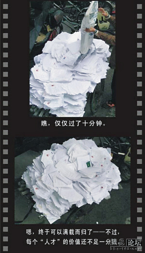 網(wǎng)友“干點(diǎn)什么好捏”日前在論壇上發(fā)出圖文帖《關(guān)于招聘,啥都不說了(應(yīng)屆生看完都得哭)》。展示了一組由其拍攝的,顯示大量應(yīng)聘者的求職簡歷被招聘單位當(dāng)廢紙賣掉的圖片。“干點(diǎn)什么好捏”更別出心裁地將拍到的連串圖片以黑白膠片的形式制作串聯(lián)起來,配上旁白,并將之命名為《超袖珍的電影:一個白色的幽默》,更在標(biāo)題下特別“奉勸”此片“求職者與應(yīng)屆生不宜”。