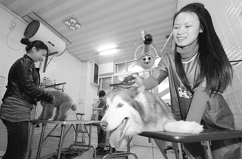 3月31日,寵物美容店店主徐曉娟(右)在為客人的寵物狗美容。2004年,貴州大學(xué)經(jīng)濟(jì)貿(mào)易系的徐曉娟大學(xué)畢業(yè)后選擇自主創(chuàng)業(yè)。她在貴陽(yáng)市開辦了一家名為“千寵萬(wàn)愛”的專業(yè)寵物美容店,由于服務(wù)專業(yè)、管理得當(dāng),生意一直不錯(cuò),月收入近萬(wàn)元。她的寵物美容店也成為大中專畢業(yè)生的實(shí)習(xí)場(chǎng)所,先后有20多位畢業(yè)生來(lái)此打工或?qū)W習(xí)。