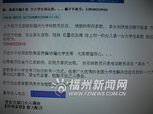 吳同學(xué)將情況反映給師大傳承家教中心。15日傍晚,在福州便民論壇,一則標(biāo)題加亮的帖子《最新詐騙手段,女大學(xué)生請注意,騙子手機號……》發(fā)布。帖子寫著:“上午我方接到福州大學(xué)教員反映,她接的家教,家長利誘她去聊天陪客,月薪上千。經(jīng)核查,該家長自稱姓林,家住左海附近,給上初一的女兒請一名女大學(xué)生當(dāng)家教。他還特意強調(diào)要家庭貧困的女大學(xué)生,該家長手機號為139xxxxxxx6”。該帖子也寫明了他們之所以曝光該家長手機號碼的原因:“我們不想讓女生被不法之徒玷污。”