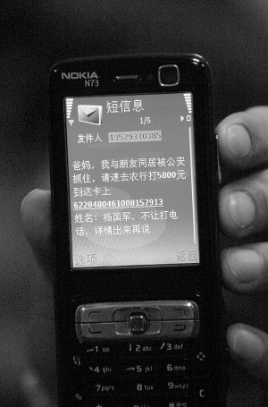 陳女士昨天對記者說,11月29日凌晨4時38分,她收到一條短信,上面寫著:“爸媽,我與朋友同居被公安抓住,請速去農(nóng)行打5800元到這卡上6228480461008157913,姓名:楊國軍,不讓打電話,詳情出來再說。”而發(fā)送人竟然是一個陌生人的號碼:13529330385。陳女士告訴記者,她女兒阿燕(化名)在肇慶某職業(yè)技術(shù)學(xué)院讀大一,由于之前已提前向她提醒說至少有四五名學(xué)生的家長都收到了這條短信,因此她并沒有再理會。