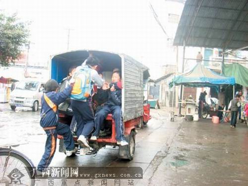 當(dāng)天霧氣很重,還下著小雨,路面潮濕。在五一西路學(xué)校門(mén)口不遠(yuǎn)的路上,一輛輛三輪摩托車雜亂的停在那里。一些看起來(lái)稍大的小學(xué)生一邊吃著手上的零食一邊往車上爬,上車之后從兜里掏出5毛錢(qián)遞給三輪摩托車手。記者發(fā)現(xiàn),那些三輪摩托車大多沒(méi)有牌照,一律的鋁皮車篷。有的已經(jīng)顯得比較破舊,連前輪的擋泥板都用鐵線綁住。而駕駛那些三輪摩托車的有男有女,有老有少,其中一輛三輪摩托車的車手看上去也就十五六歲。記者看到,其中一輛三輪車上了10多名小學(xué)生,還有一兩個(gè)要往上擠,但車上已經(jīng)沒(méi)有了空間,這兩個(gè)學(xué)生居然站在門(mén)口,雙手抓著車篷頂部,半個(gè)身體還露在外面。