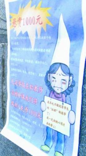 圖中有兩個(gè)圖案很“刺眼”:一個(gè)是黃色的爆炸圖形上寫著“懸賞1000元”;另一個(gè)是占到整張舉報(bào)告示近一半面積的女教師形象。