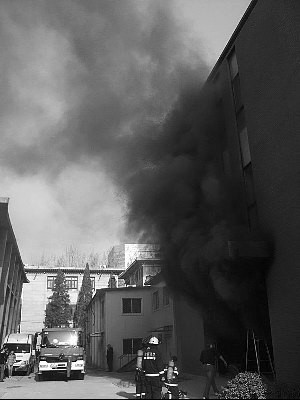 經消防員撲救,大約20分鐘后,濃煙漸漸變小,消防員和幾名同學進入實驗室,將未燒毀的實驗儀器、資料和一些辦公用品轉移出來。