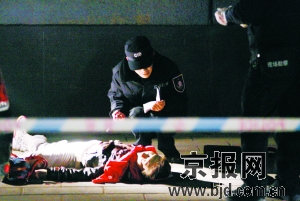 在事發(fā)現(xiàn)場,小穎倒在了一輛黑色雪鐵龍轎車的旁邊,散開的黑色外套里,依稀能看見左前胸的一片殷紅,黑色手包和已經(jīng)辨不出顏色的圍巾就在她的身旁。而一把十幾厘米長的水果刀還放在小峰倒下的位置。小穎的尸體旁邊,警方正在進(jìn)行現(xiàn)場勘查。