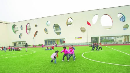 昨日下午,記者來到草堂小學(xué)翠微校區(qū),4棟通過走廊連為一體的4~5層的建筑格外引人注目。正對學(xué)校大門的墻體,鑲著10多個彩色的橢圓。設(shè)計者、西南交通大學(xué)教授王蔚介紹說,翠微校區(qū)占地20余畝,建筑面積一萬余平方米,而總投資僅 2000多萬元。“這些彩色的橢圓圖案,代表著水滴。陽光下,‘水滴’呈現(xiàn)出不同顏色,這代表了學(xué)生們的不同個性。校舍以‘陽光下的水滴’為設(shè)計構(gòu)思,充分表達(dá)了在我國素質(zhì)教育的原則下,尊重個性發(fā)展,尊重少年兒童人格特征的理念!