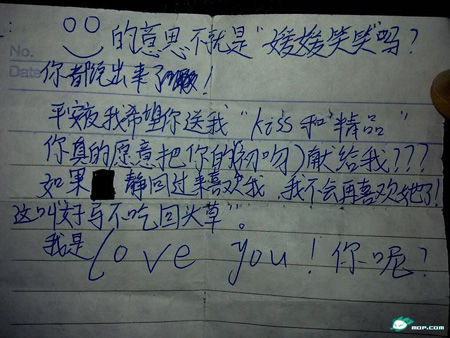 紙條內(nèi)容除了當事雙方如此鄭重的表白外,還記錄了一段男生向女生索要初吻的文字,男生希望女生在一個特定的時間把“kiss(吻)”送上,他還特別附加問一句“你真的愿意把你的(初吻)獻給我嗎?”