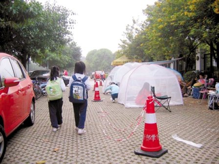 昨晚,記者來(lái)到祈福新村學(xué)校門口,昏黃的燈光下,疲憊不堪的家長(zhǎng)們坐在躺椅上閑聊,有的干脆鉆到自帶的蒙古包帳篷里睡覺(jué)。現(xiàn)場(chǎng)到處彌漫蚊香和驅(qū)蚊水味道。