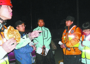 昨天晚上,當(dāng)記者來(lái)到北京市植物園西門的時(shí)候,門旁邊的花池子邊上,放著救援隊(duì)員帶來(lái)的烙餅、鴨脖子、雞腿,還有成箱的礦泉水,下午4時(shí)出發(fā)前兩組隊(duì)員剛剛返回,很多人因?yàn)樯仙角拔闯燥埗奸_始“狼吞虎咽”。