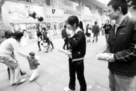 40分鐘后,9名學(xué)生來到觀音橋。10時許,張玉琴鼓足勇氣走向一家婚紗店,老板給了她一疊宣傳冊,“不管用何種方法,只要是能找夠15名顧客來店咨詢,就可得到30元錢!边@是這個團(tuán)隊第一個找到“工作”的人。