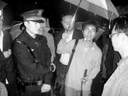 “下午2點20分左右,距比賽開始僅僅剩下40分鐘了,賽場內前奏的音樂已經(jīng)響起,這時‘米黃外套’回來終于告訴大家,由于此次用的是賽車場發(fā)給上海市中學生的團體票,大學生不能入場,所以今天可能‘沒戲了’。此時九陽旅行社的洪經(jīng)理看起來也焦頭爛額,他沒有打傘,站在大雨里,水珠不斷順著頭發(fā)流下!