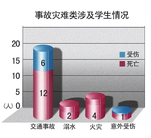 交通事故 2008年發(fā)生的10起交通事故中,5起發(fā)生在外地,分別系學(xué)生自行外出旅游、寒暑假返鄉(xiāng)等途中遭遇車禍,共造成7人死亡;另有5起為學(xué)生在本市校外社會道路上遭遇車禍,造成5人死亡。
