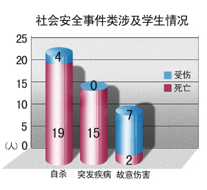 自殺 2008年高校共發(fā)生社會安全類事件45起(見圖二),涉及學(xué)生47人,造成36人死亡,11人受傷。其中居首位的是自殺事件,共23起,造成 19人死亡,4人未遂;15名大學(xué)生因突發(fā)疾病死亡,主要由于心臟、哮喘等疾病所致;校內(nèi)外故意傷害事件7起,造成2名學(xué)生死亡7人受傷,其中5起為三人以上的斗毆事件。