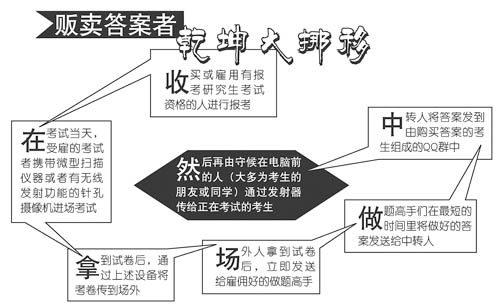 首先,雇用有報考研究生考試資格的人進行報考,在考試當天,受雇者攜帶微型掃描儀器或有無線發(fā)射功能的針孔攝像機進入考場考試,拿到試卷后,通過上述設備將考卷傳到場外,場外人拿到試卷后,立即發(fā)送給雇用好的做題高手,做題高手在最短的時間里將做好的答案發(fā)送給中轉人,中轉人再將答案發(fā)到由購買答案的考生組成的QQ群中,然后再由守候在電腦前的人(大多為考生的朋友或同學)通過發(fā)射器傳給正在考試的考生。