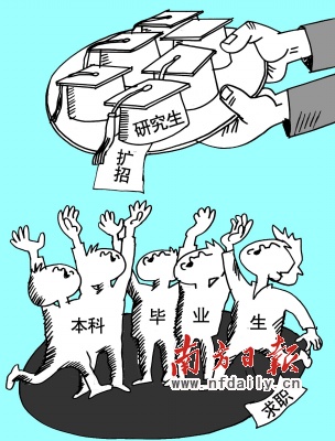 據(jù)悉,2009年全國(guó)將有610萬(wàn)應(yīng)屆畢業(yè)生,其中廣東高校畢業(yè)生人數(shù)達(dá)到33.1萬(wàn)人。截至3月10日,廣東省普通高校本科畢業(yè)生簽約率僅為 7.61%,而去年同期大學(xué)畢業(yè)生和?茖W(xué)校畢業(yè)生的簽約率約為60%。“嚴(yán)峻的就業(yè)形勢(shì)下,教育部門(mén)出臺(tái)研究生大幅擴(kuò)招的計(jì)劃,很明顯就是有‘分流’的意味!