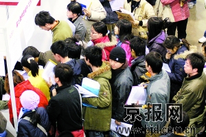某高校英語(yǔ)系研究生即將畢業(yè)的吳婷2月8日剛剛參加完在老國(guó)展舉行的大型人才招聘會(huì)。雖然在抱怨招聘會(huì),但是看到緊接著14至15日同樣在老國(guó)展有招聘會(huì)的消息,吳婷還是強(qiáng)打起精神,握緊拳頭:“還是再去碰碰運(yùn)氣吧!”