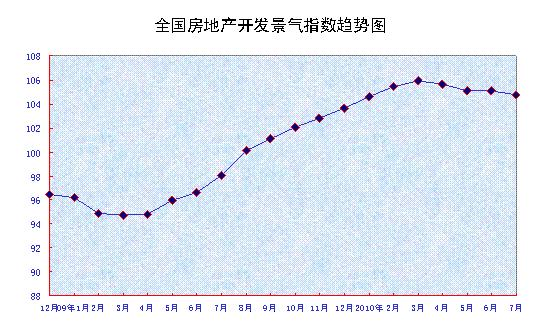 中新網(wǎng)8月10日電 據(jù)國(guó)家統(tǒng)計(jì)局網(wǎng)站消息,7月份,全國(guó)房地產(chǎn)開發(fā)景氣指數(shù)(簡(jiǎn)稱“國(guó)房景氣指數(shù)”)為104.72,比6月份回落0.34點(diǎn),比去年同期提高6.71點(diǎn)。