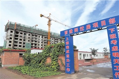 9月21日上午,記者驅(qū)車趕往太平村原址。在順義區(qū)北二環(huán)路南側(cè),記者看到,十余棟高樓已經(jīng)拔地而起,外部的墻體結(jié)構(gòu)均已經(jīng)建設(shè)完畢,但尚未粉刷。在工地的入口處,清晰地寫(xiě)著“回遷房”等字樣。據(jù)工人們稱,工程是從年后開(kāi)始的,曾經(jīng)在4月前后停了一段時(shí)間,后來(lái)又開(kāi)始復(fù)工。