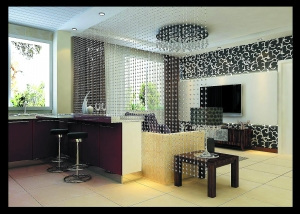 此方案為一居室戶(hù)型,該戶(hù)型的居住人群多為年輕人,因此方案為現(xiàn)代簡(jiǎn)約風(fēng)格。將廚房完全敞開(kāi),與客廳連在一起,采用島臺(tái)的餐桌既節(jié)省空間,又時(shí)尚大方,使用水晶簾將沙發(fā)與廚房隔開(kāi),具有通透性。在顏色上采用米黃色的墻面,與黑白搭配的壁紙和紅色烤漆櫥柜結(jié)合,時(shí)尚感極強(qiáng)。(盧柳兆)
