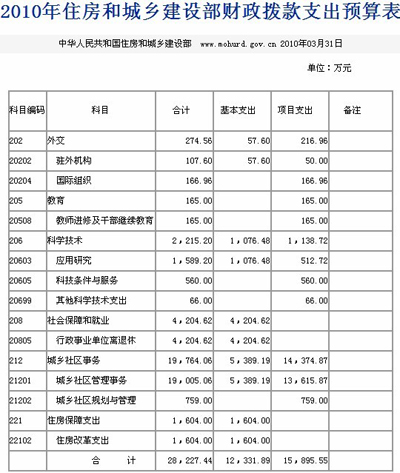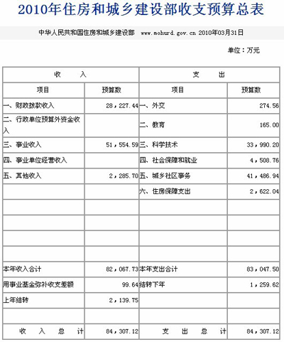 中新網(wǎng)3月31日電 住房和城鄉(xiāng)建設(shè)部網(wǎng)站今日發(fā)布住房和城鄉(xiāng)建設(shè)部部2010年部門(mén)預(yù)算表,其中包括2010年收支預(yù)算總表以及2010年財(cái)政撥款支出預(yù)算表。這是繼國(guó)土資源部及財(cái)政部公開(kāi)部門(mén)預(yù)算后,第三個(gè)公開(kāi)預(yù)算的中央部委。