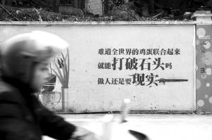 日前,讀者吳先生打進(jìn)本報(bào)熱線(xiàn)稱(chēng),他在南岸一新建小區(qū)外看到了這樣一條標(biāo)語(yǔ),讓他很費(fèi)解,他不知道開(kāi)發(fā)商打出這條廣告宣傳語(yǔ)是什么意思?吳先生說(shuō),這句宣傳語(yǔ)這樣寫(xiě)道:“難道全世界的雞蛋聯(lián)合起來(lái),就能打破石頭嗎?做人還是要現(xiàn)實(shí)些。”