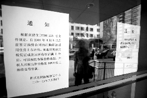 貼在玻璃門上的通知說:“根據(jù)京建住(2008)225號(hào)文件規(guī)定,自2008年4月8日之前簽訂購房合同的已購經(jīng)濟(jì)適用住房上市出售,須取得契稅完稅憑證或房屋所有權(quán)證滿5年后,可以按照市場(chǎng)價(jià)格出售,產(chǎn)權(quán)人應(yīng)按出售價(jià)格的10%補(bǔ)交土地收益等稅款!