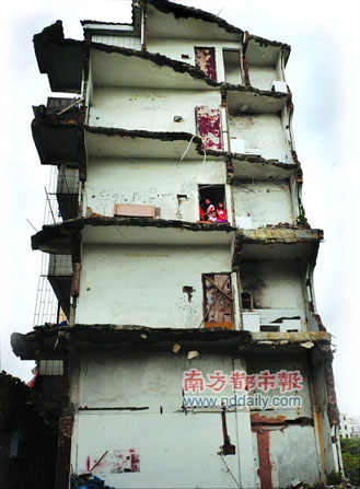 與租客不同,屋主比較擔(dān)心自身安全問題!捌綍r(shí)不起風(fēng)還好,一起風(fēng)我們就有些害怕。”屋主稱,他們一家三代6口人都住在這里,每次臺(tái)風(fēng)來臨滿樓都是大風(fēng),有一次甚至嚇得兒媳婦跑到賓館開房睡覺。屋主稱,這棟房屋是自己與表弟在1993年修建的,占地面積約有160多平方米,兩家各占一半。幾年前寶地康泰房產(chǎn)公司改造紅山村,表弟與開發(fā)商達(dá)成協(xié)議后搬走,自家卻沒能與對(duì)方談妥。去年6月6日,開發(fā)商將屬于表弟的那一半拆除掉,才出現(xiàn)如此的“半邊樓”。