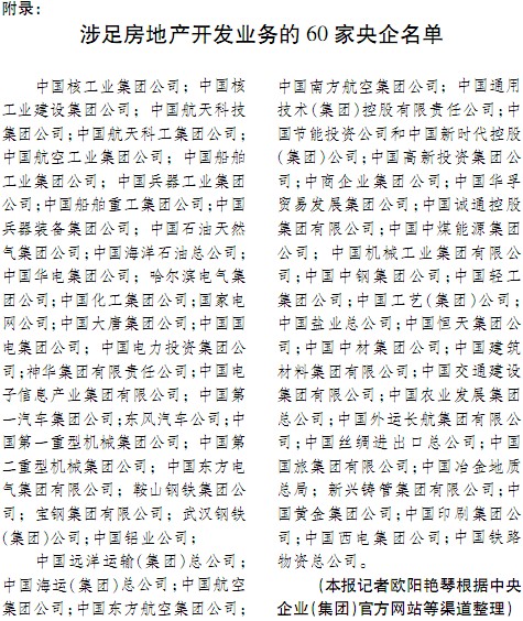 中國經(jīng)濟時報記者近日根據(jù)中央企業(yè)(集團)官方網(wǎng)站等渠道,整理出一份包含了60家涉足房地產(chǎn)開發(fā)的企業(yè)名單(見附錄)。