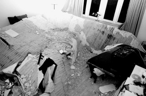 記者在顧小姐家中看到,她的屋子有里外兩間,窗戶臨街的是一間16平方米大的臥室。此時(shí)一張“泥網(wǎng)”蓋住了臥室內(nèi)的大小家具,一臺(tái)50英寸的背投彩電被塌下的泥墁砸倒后橫在地上,天花板上只剩下了裸露在外的木條吊頂。
