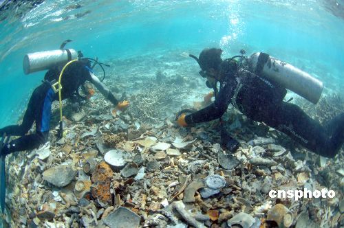 | 八日,中國遠(yuǎn)?脊诺谝凰页链魃橙A光Ⅰ號部分文物三百余件,首次在?谙蛎襟w展示。據(jù)介紹,經(jīng)國家有關(guān)部門批準(zhǔn),今年三月十五日至五月八日歷時五十余天,由三十一位水下科考人員西沙考古工作隊,在西沙群島對華光礁水下Ⅰ號沉船遺址和北礁沉船遺址,開展了搶救性發(fā)掘和水下考古調(diào)查工作,迄今共發(fā)掘并運送上岸文物近萬件,是次水下考古已投資四百余萬元。華光礁屬中國海南省西沙群島范圍,位于永樂群島南部。華光礁Ⅰ號沉船遺址位于華光礁環(huán)礁內(nèi)側(cè),一九九六年由我國漁民發(fā)現(xiàn)。中新社發(fā) 西沙考古隊 攝