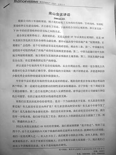 昨日,重慶一網(wǎng)友自稱貼出隆鑫地產(chǎn)一份高層內(nèi)部南山會議講話稿的照片,其稱在春節(jié)后,隆鑫地產(chǎn)欲對旗下樓盤降價,以期快速回籠資金去買地擴張規(guī)模。從內(nèi)容上看,講話者像是為隆鑫降價做動員工作,表明降價的目的是快速回籠資金并擴大規(guī)模。網(wǎng)友在跟帖中稱,萬科松山湖會議紀要事件驚現(xiàn)重慶版,隆鑫降價講話遭網(wǎng)絡(luò)泄密。隆鑫地產(chǎn)一位不愿意透露姓名的高層告訴記者,內(nèi)部正在追查泄密者。