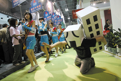 記者在現(xiàn)場看到,這名扮相搞笑的網(wǎng)友大約20來歲,他頭頂一個大大的紙做的“囧”字,背上則背著一個高樓模型,在細雨中雙手抱頭,兩膝跪地,在地面上做掙扎狀。隨后,他分別又擺了苦干、解脫等Pose。一個小時的表演引來現(xiàn)場上百市民圍觀。由于造型搞笑,動作搞怪,在男子表演的現(xiàn)場,吸引了眾多“粉絲”,許多市民都與他“合影留念”。與“囧”男一同前來的QQ群友在人群中散發(fā)著20多條自制的網(wǎng)絡搞怪語言。