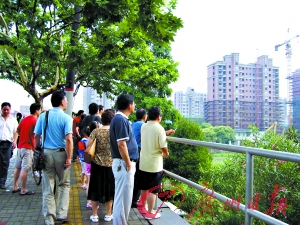 一位在購(gòu)房者臨時(shí)接待點(diǎn)坐了兩天、不愿透露姓名的業(yè)主告訴記者,該樓盤是在2008年11月開盤的,第一期的起價(jià)是每平方米1.2萬元,到今年4月下旬,第二期開盤的時(shí)候,起價(jià)已經(jīng)躥升至每平方米1.3萬元,今年5月下旬,第三期開盤,每平方米的起價(jià)又漲了500元。