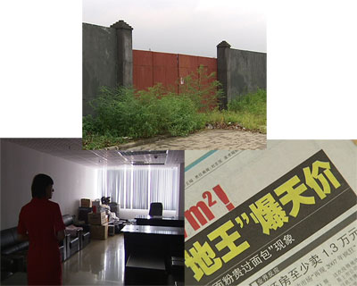 2007年9月11日,保利地產(chǎn)在一天之內(nèi)以8769和8112的高昂價(jià)格,拿下了這里的兩塊土地,成為地王。現(xiàn)在土地已經(jīng)被鐵皮墻包圍起來。大門門口雜草叢生,看起來很少有人光顧。我們找到了看守工地的施工人員。