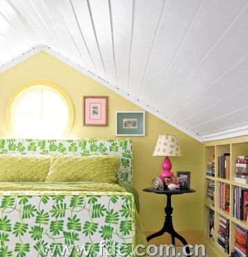 陽(yáng)光般鮮亮的黃色和充滿(mǎn)活力的綠色,讓這個(gè)小空間充滿(mǎn)愉悅感,定做的書(shū)柜恰好利用了矮小的傾斜空間。