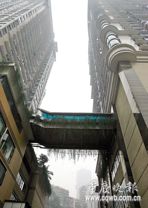 嘉園有業(yè)主500余戶,錦園有業(yè)主600余戶。當(dāng)初,開發(fā)商特意在兩樓之間設(shè)計(jì)了一座天橋,目的是讓兩個(gè)小區(qū)的空中花園、健身器材等可以共享,更重要的是方便兩個(gè)小區(qū)業(yè)主出入——錦園的業(yè)主可以經(jīng)嘉園直達(dá)臨江門、解放碑,嘉園業(yè)主也可經(jīng)錦園到一號(hào)橋。