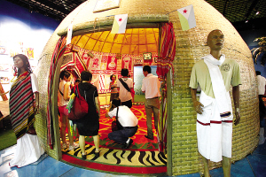 外墻頂部覆蓋著手編織帶,兩壁腰墻和地面分飾有手編掛毯和地毯,內(nèi)墻上掛有圖案抽象的繪畫和手工藝品,小小民居包羅萬象——一走進(jìn)非洲聯(lián)合館內(nèi)的吉布提館,就能見一座蝸形民居“浮于水上”。這是吉布提游牧民族阿法爾人的傳統(tǒng)民居,叫“達(dá)布瓦塔”。上海世博會(huì)上的這個(gè)72平方米大小的達(dá)布瓦塔,全系在吉布提國(guó)內(nèi)造好再裝進(jìn)集裝箱漂洋過海而來,所以俱是原汁原味的吉布提當(dāng)?shù)仫L(fēng)情。