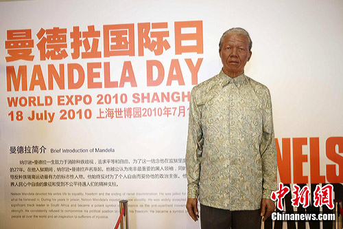 當(dāng)天,一尊來自上海杜莎夫人蠟像館的曼德拉蠟像“走入”南非館,栩栩如生的造型讓有人覺得仿佛這位“人權(quán)斗士”真的親臨世博園,游客紛紛掏出相機、駐足與偉人留影。
