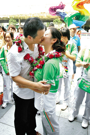 編號:20108161314。兩位新人從園區(qū)志愿者部部長夏科家手上接過了獨一無二的世博結(jié)婚證。這個編號不但是對他們婚禮吉時的記錄,也是對他們幸福生活的美好祝福。“親一個!親一個!”圍在新人周圍的99位“小白菜”可不會輕易放過這位和自己朝夕相處的老師,開始起哄。大庭廣眾之下,施諾哪好意思,對著新娘的額頭就是一下蜻蜓點水,想要糊弄過關(guān)!安凰!不算!”聲音越來越響,不少游客也忍不住駐足觀望。迫于“群眾壓力”,兩人在七彩之心下深情一吻,接受所有人的祝福。