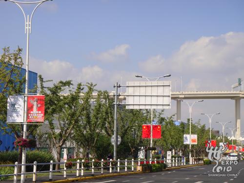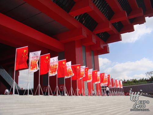 中國國家館9米、14米平臺(tái)及周邊地區(qū)、世博大道、各出入口和世博軸相關(guān)區(qū)域都進(jìn)行了精心布置,共懸掛招風(fēng)旗近400對(duì)、墻貼20余幅、巨幅插旗24面,園區(qū)處處洋溢著濃郁的節(jié)日氣氛。