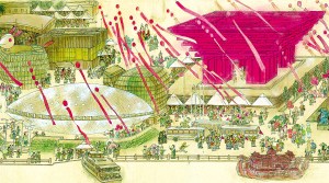 在中國(guó)館省區(qū)市館入口處,這幅長(zhǎng)21米、寬0.47米的繪畫作品吸引了每一個(gè)經(jīng)過的人。畫卷描繪了浦江兩岸世博園區(qū)內(nèi)所有的場(chǎng)館以及近7000個(gè)游人,畫面上南浦、盧浦大橋橫跨兩岸,路上車輛、江面游輪、空中飛艇往來繁忙,園區(qū)內(nèi)形形色色的建筑中間人流熙熙攘攘,一派熱鬧繁華的景象。有意思的是,長(zhǎng)卷不僅展現(xiàn)了世博園區(qū)恢宏的場(chǎng)景,還刻畫了許多生動(dòng)的細(xì)節(jié),如畫中有兩個(gè)孩子在沖向他們喜歡的場(chǎng)館途中,男孩的帽子被風(fēng)吹走了;一對(duì)情侶在深情擁吻;“小白菜”勸說躺在長(zhǎng)椅上睡覺的參觀者等。