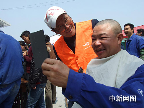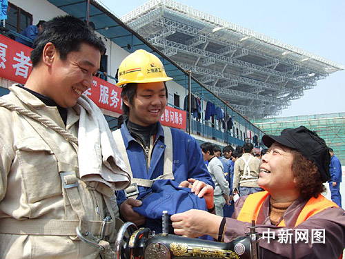 聽說服務(wù)“大篷車”要來,工地建設(shè)者早早作了準(zhǔn)備,穿破的衣褲,穿壞的鞋都拿了出來。一位來自河南,名叫張慶國的25歲民工,由于工地工作忙,已半年沒理發(fā)了,逢午飯休息間,他對理發(fā)的志愿者師傅說:“請幫我理了光頭吧,省得頭發(fā)長難受!10分鐘后,當(dāng)他拿著小鏡子,照著新理的光頭時(shí),高興地指著腦袋說:“這下可解決了”。一旁,兩位浙江籍青年拿著剛修補(bǔ)好的球鞋,笑得合不攏嘴!吧虾H苏鏌崆,手藝也高。我這修好的球鞋,看不出補(bǔ)丁,真得太好了!
