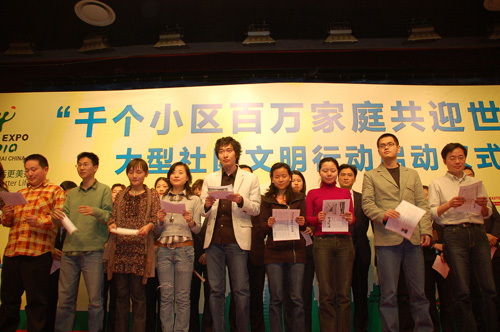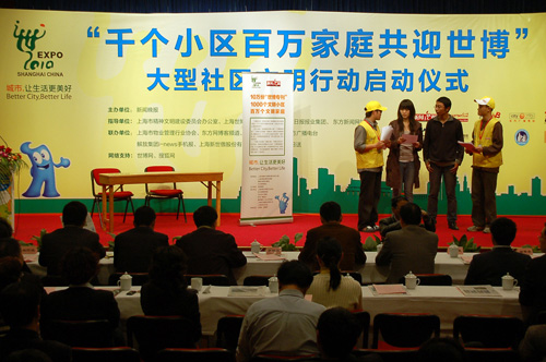 4月8日下午,“千個(gè)小區(qū)百萬(wàn)家庭共迎世博”大型社區(qū)文明行動(dòng)啟動(dòng)儀式舉行。據(jù)悉,為了讓更多市民參與世博、服務(wù)世博,活動(dòng)將從2009年4月一直持續(xù)到2010年10月結(jié)束。