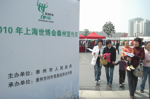 為了讓更多的泰州市民和企業(yè)“了解世博、支持世博、貢獻(xiàn)世博、共享世博”,江蘇省泰州市政府和上海世博局于4月6日至12日分別在溱湖國家濕地公園和位于鬧市區(qū)的濱河廣場開展了“2010年上海世博會泰州宣傳周”活動。